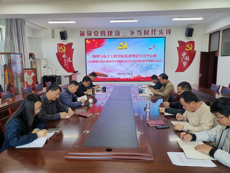 5月6日上午,物理与电子工程学院党委理论学习中心组在2号综合楼3楼会议室举行主题教育专题学习会,集中学习习近平新时代中国特色社会主义思想的世界观和方法论。学院党委书记田兆胜主持学习会,党委理论学习中心组成员参加学习会。