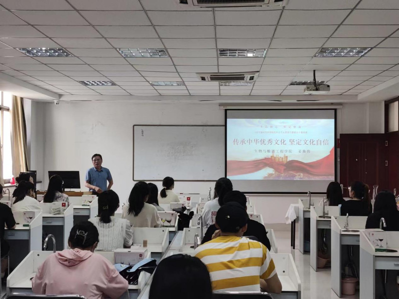 生物与酿酒工程学院党委负责人从哲学角度出发引导学生探讨文化寻根的重要意义,一个国家、一个民族的强盛,总是以文化兴盛为支撑,没有中华文化繁荣兴盛,就没有中华民族伟大复兴。生物与酿酒工程学院党委负责人指出,坚定文化自信是一个国家、一个民族对自身文化价值的充分肯定;传承发扬中华优秀文化是中华民族更具本质性的精神追求,是国家富强和民族复兴的动力源,是新时代中国社会发展的精神标识。新时代,我们要在深刻理解历史传统与时代品格基础上,切实把握文化自信的思想根基与现实价值,不断增强文化自信的底气。
