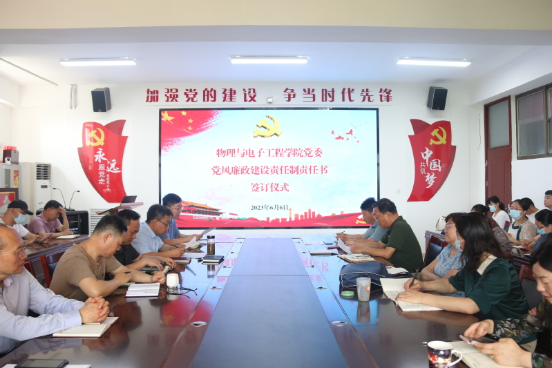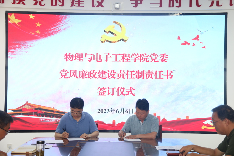 为全面贯彻党的二十大精神,压紧压实全面从严治党、党风廉政建设和意识形态工作责任,层层传导压力、人人肩负责任,切实将各项责任落到实处。6月6日下午,物理与电子工程学院党委组织党委书记、院长与班子成员、各党支部书记、系主任签订2023年党风廉政建设、意识形态工作责任制责任书。