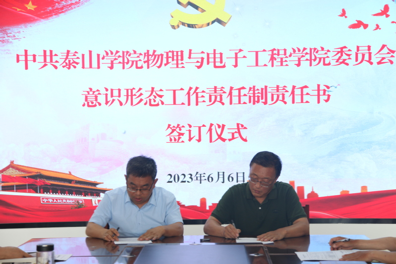 会上举行了党风廉政建设和意识形态工作责任书签订仪式。田兆胜和陈君代表学院领导班子与分管学院工作的班子成员、各系主任、党支部书记层层签订了《物理与电子工程学院党风廉政建设责任制责任书》和《物理与电子工程学院意识形态工作责任制责任书》。签订责任书后,老师们表示将认真落实好主体责任,扎实抓好工作职责范围内的党风廉政建设和意识形态工作责任,结合习近平新时代中国特色社会主义思想主题教育和学院教学、科研、社会服务工作,补短板、强弱项,推动全面从严治党在学院落地见效。