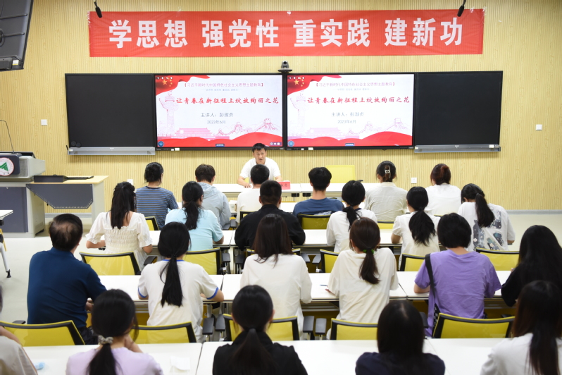 彭淑贞的授课分为上下2个章节。他首先从深刻领会党的二十大的主题和“三个务必”,深刻领会新时代十年的伟大变革的深远影响,深刻领会开辟马克思主义中国化时代化新境界重大意义任务,深刻领会中国式现代化、全面推进中华民族伟大复兴的使命,深刻领会全面建设社会主义现代化国家的总体部署,深刻领会社会主义现代化国家建设的重要保障和深刻领会推进全面从严治党、深入推进新时代党的建设新的伟大工程等7个方面全面系统阐述了党的二十大精神,并着重强调了习近平总书记关于新时代青年工作重要论述和对青年学生的殷切厚望。他强调,党的二十大从战略全局深刻阐述了新时代坚持和发展中国特色社会主义的一系列重大理论和实践问题,科学谋划了未来一个时期党和国家事业发展的目标任务和大政方针,在党和国家历史上具有重大而深远的意义,希望广大青年学生认真学习贯彻习近平新时代中国特色社会主义思想和党的二十大会议精神,认真领悟关于党和国家事业发展大政方针和战略部署的历史逻辑、理论逻辑、实践逻辑,听党话、跟党走,凝聚智慧和力量,进一步坚定理想信念,刻苦学习、砥砺品德、陶冶情操,在练就过硬本领中担当时代重任,让青春在民族复兴和强国建设的新征程中绽放绚丽之花。